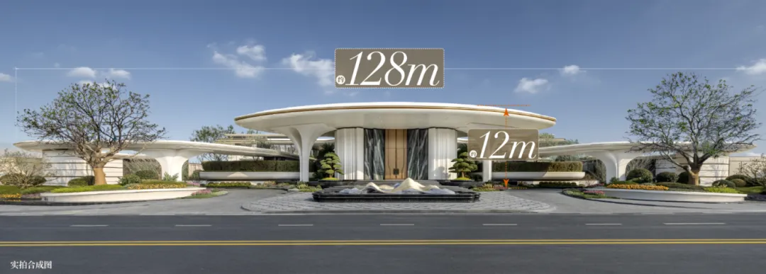 建发·海耀的大门做到了近12米高度,近11米悬挑,约58米横向宽度,加上两侧景墙更达到约128米的尺度。这不仅是门,这是一座横向跨越专业级足球场长度(约110米)的“城市雕塑”。