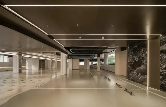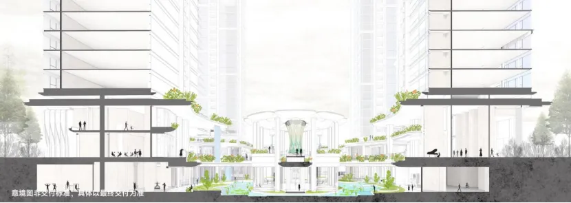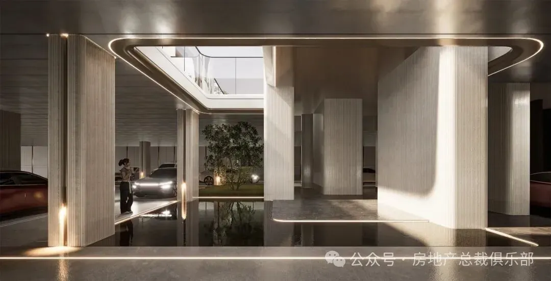为彻底消融城市与社区的界限,项目以“超级底盘”重构社区基座。通过抬高地库、整合车站与商业配套,将地下空间转化为多功能垂直枢纽。