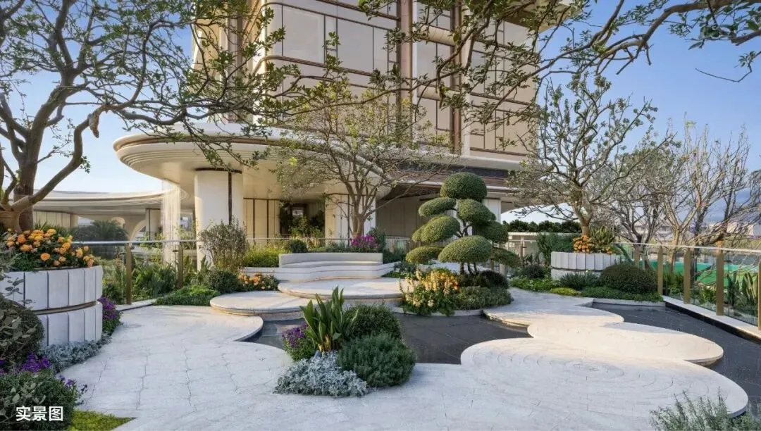 全冠移植约18米朴树、黄花梨、小叶紫檀、罗汉松、油橄榄等树种,让每一位居住者,都能与自然建立亲密连接。1.5层为局部架空层,融合川西红石滩旷野与高原草甸浪漫,以沙生植物、造型灌木及宿根花卉构建低维护群落,演绎海拔2800-3900米高原的生命驿站。