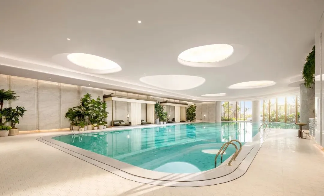 会所采用地上两层、地下一层的立体布局,并通过风雨连廊巧妙串联,实现全域无缝互联。内部涵盖私宴厅、健身房、普拉提室、雪茄室、书吧、泳池、茶室等多元功能。