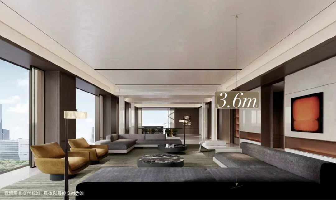约3.6米层高还有一个容易被忽略,但至关重要的意义:那就是高端定制的适配性。这个资产量级的业主定制化是基本需求,而定制化的家私或者装饰往往需要更充分的空间承载。海耀全系约3.6米层高(顶层除外),保证未来所有的居住者,不管是大尺寸艺术品的收藏,还是个性化场景定制,都能充分满足,让家真正成为业主安放审美与品味的精神场域。