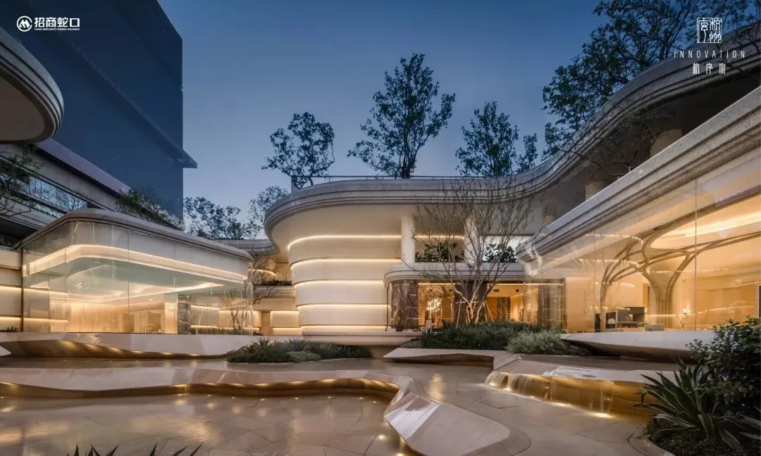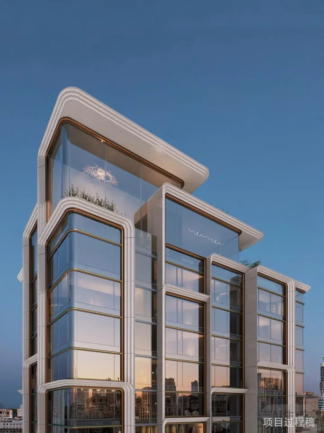 元序采用大面玻璃幕墙,通过搭配仿石铝板、釉面陶板等高端材质,组成“超流体屏”;将天然石材与高迪曲线完美搭配,虽为现代风,却无绝对直线棱角,自然形成艺术感极强的建筑单体。