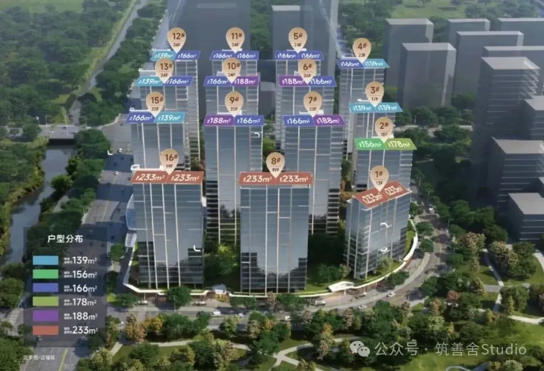 项目由9栋18-26层的高层组成,共256户,全坐北朝南,阵列式排布,南北通透板楼,独栋独单元。楼间距:南北最低41.4米,最大56.5米,大部分约52米。户型面积涵盖265-475㎡。