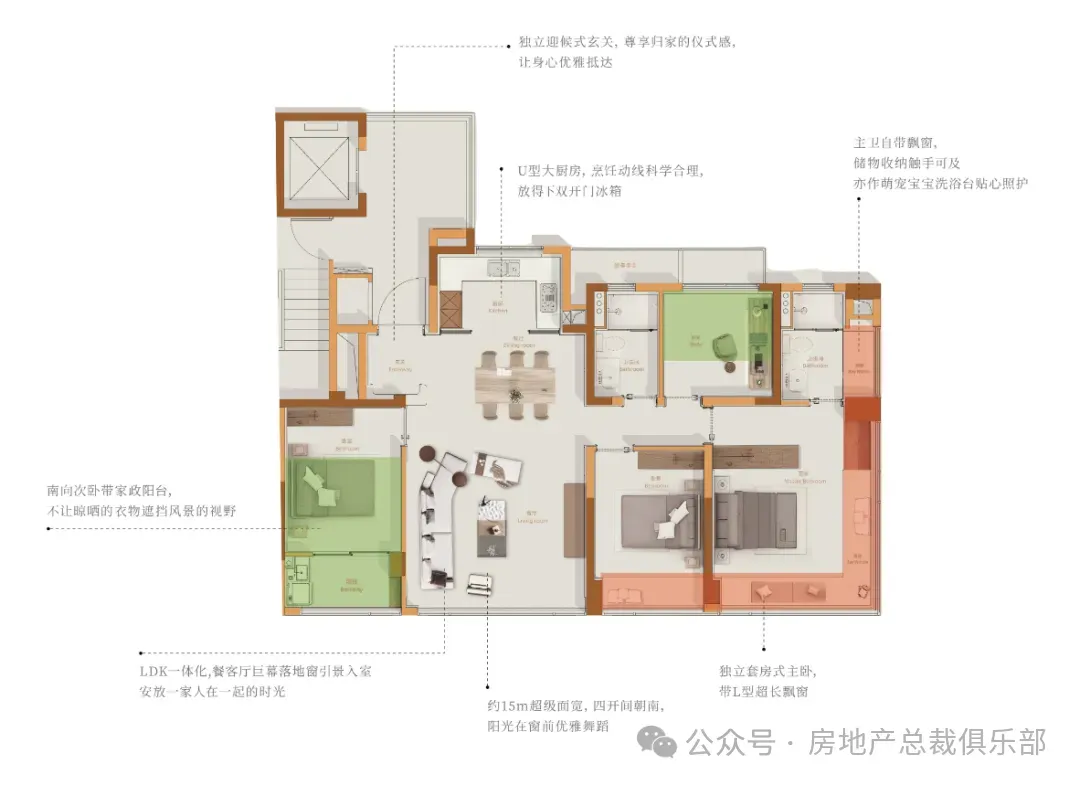 类一梯一户设计,搭配270°自然采光的独立电梯厅,带来如豪宅入户花园般的私享体验;进门独立迎候式玄关,更是将归家的尊享仪式感,拉高了一个Level。约15米奢阔面宽,超尺度的四开间朝南,让家中沐阳指数满级。