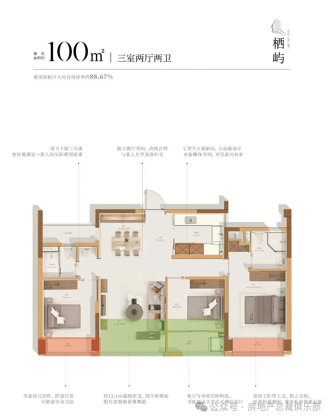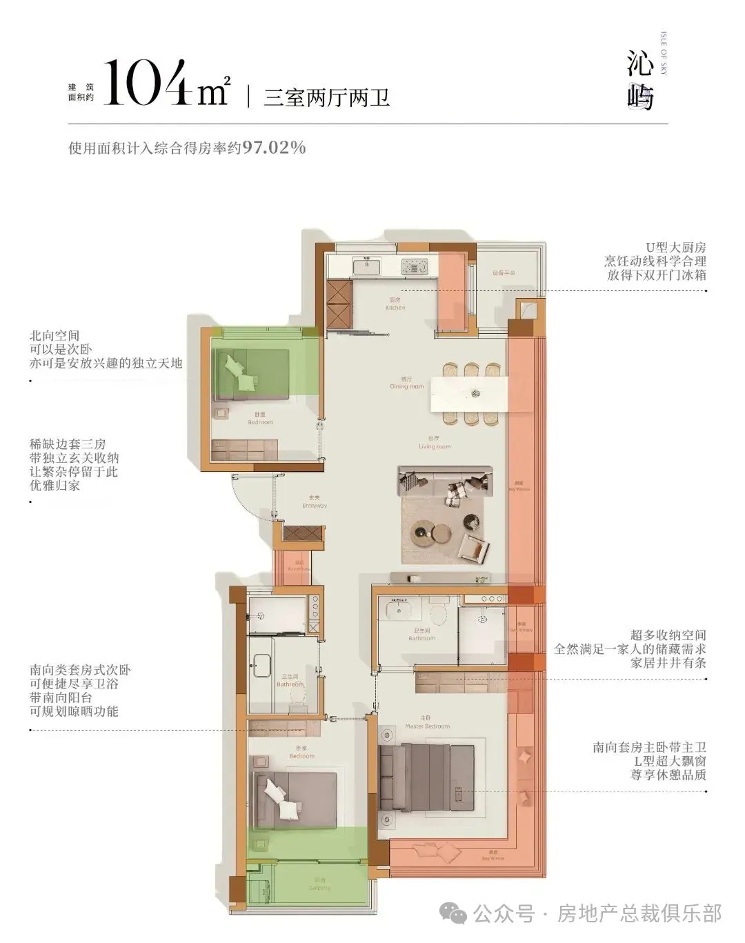 大量赠送面积的拓展,使其拥有约97.44%的超高得房率,堪比市场面主流约150㎡+户型的实用空间。