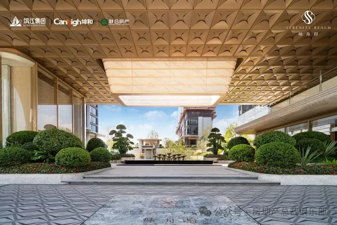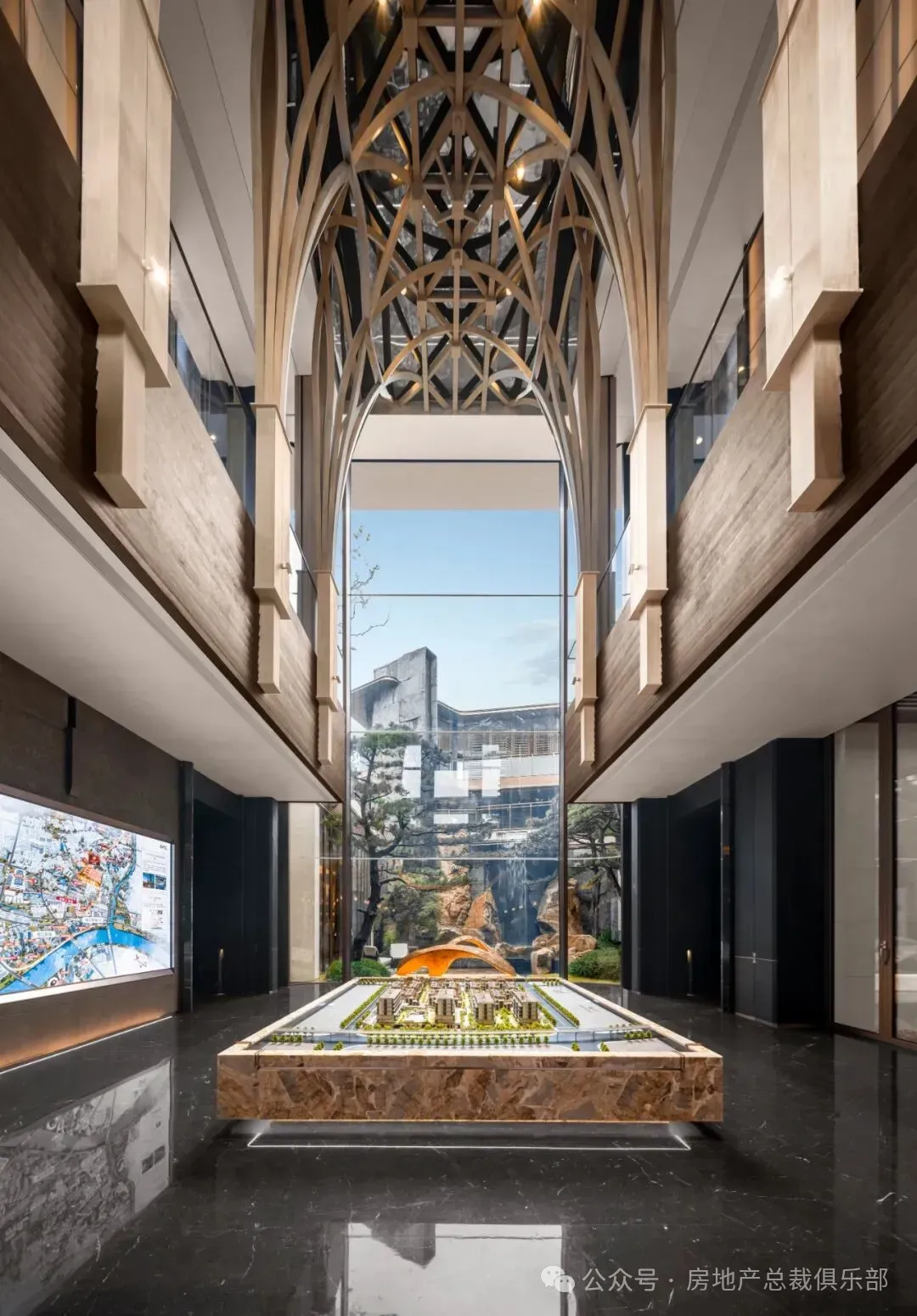 建筑结构上,项目结合在地文化匠造杭派美学住宅。比如,接待厅的斗拱同源六和塔宋式斗拱,尽显“天地四方”和合的贵胄感与强烈的场域感。