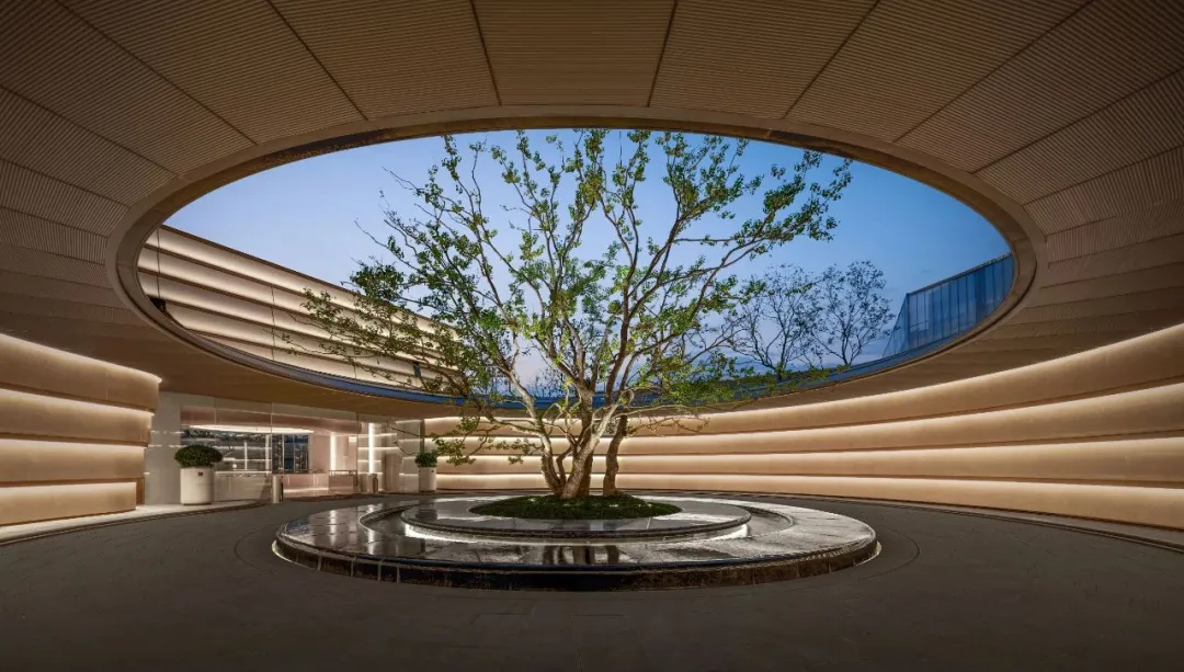 中庭园林负一层五彩池畔,栽种了一棵高度超过20米,冠幅超过10米的点景朴树。而整个大区景观当中,还将呈现一棵模拟《山海经》中通天建木的约百年树龄的朴树。