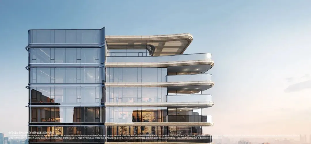 杭序府的外立面采用弧线转角阳台+蓝灰色钢化LOW-E玻璃,公建化立面拥有超高窗墙比。同时,大量曲线元素的运用,不仅造价昂贵,而且极具辨识度,成为区域的颜值担当。