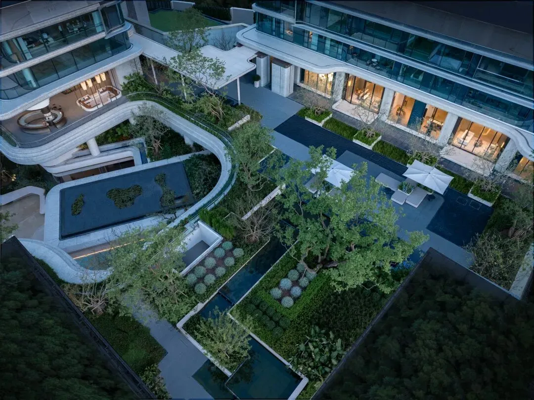 如玺华院是杭州第一个采用架空平台层的低密项目,第一次实现了「地面绿化+空中花园」的双重景观设计。