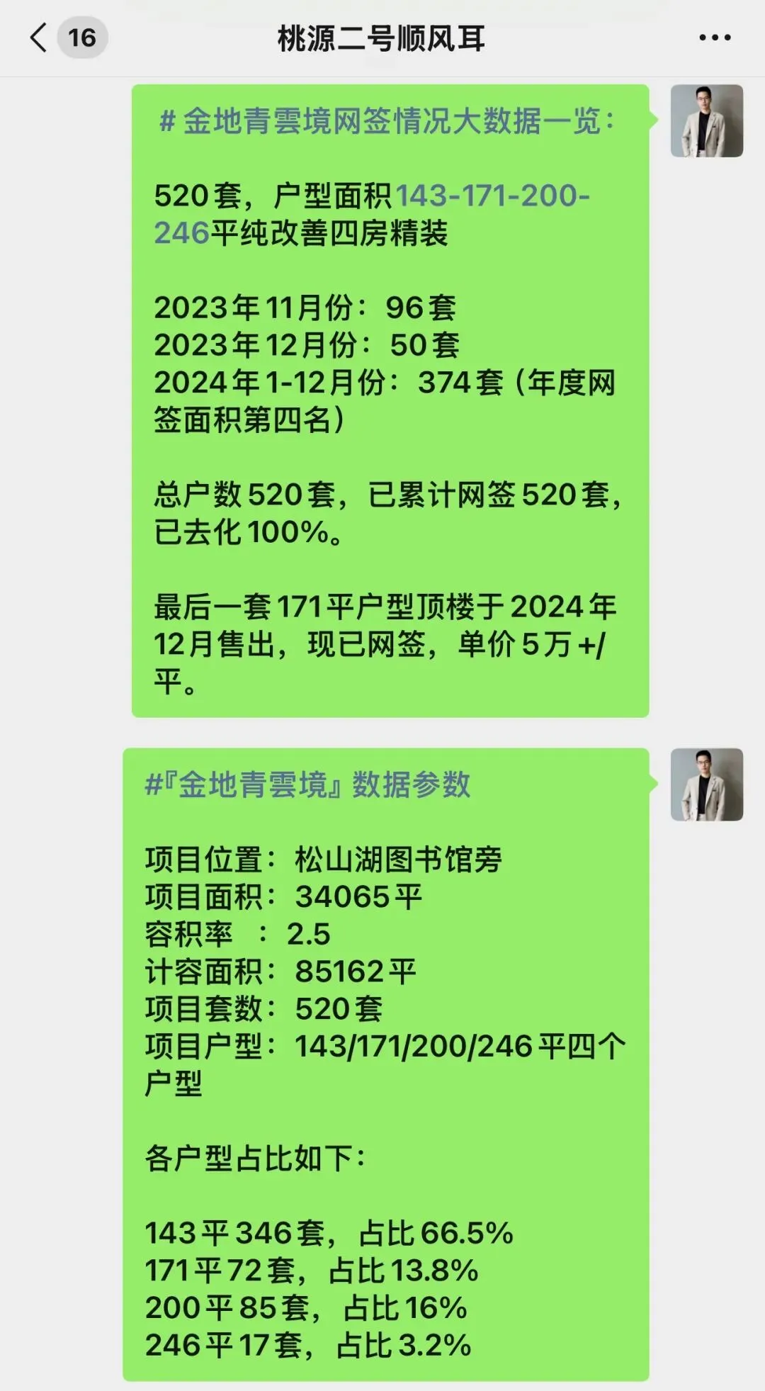 回顾项目的一手历程:作为2023-2024年的现象级红盘,金地青云境520套纯改善四房(143/171/200/246平)早已全部网签,去化率100%。最后一套171平顶楼,更是以单价5万+的价格完美收官。