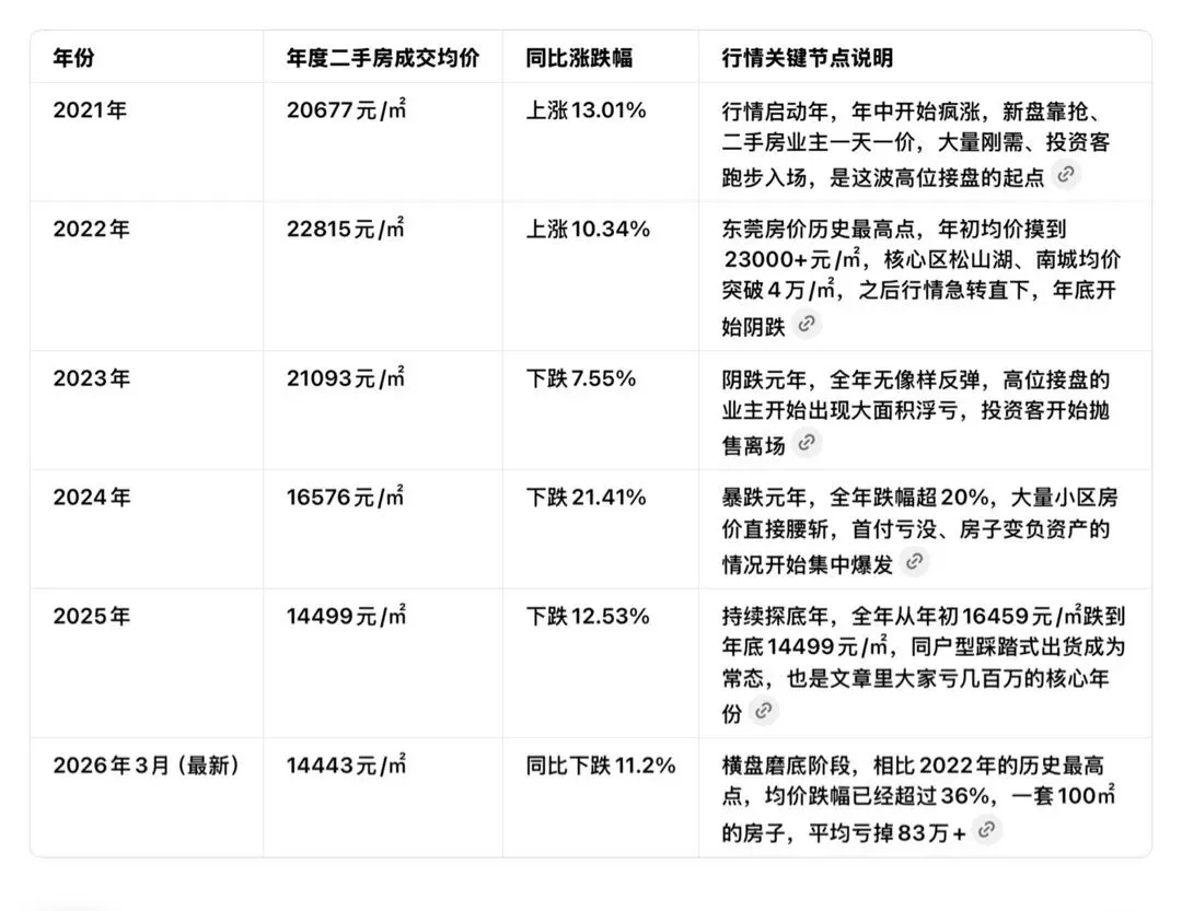 第一,绝大多数人都踩在了20-21年的历史最高点。那两年东莞的行情疯到什么程度?新盘靠抢,二手房业主一天一个价,很多人被市场裹挟着,怕“再不买就永远买不起了”,脑子一热就冲了,结果直接接在了山顶。