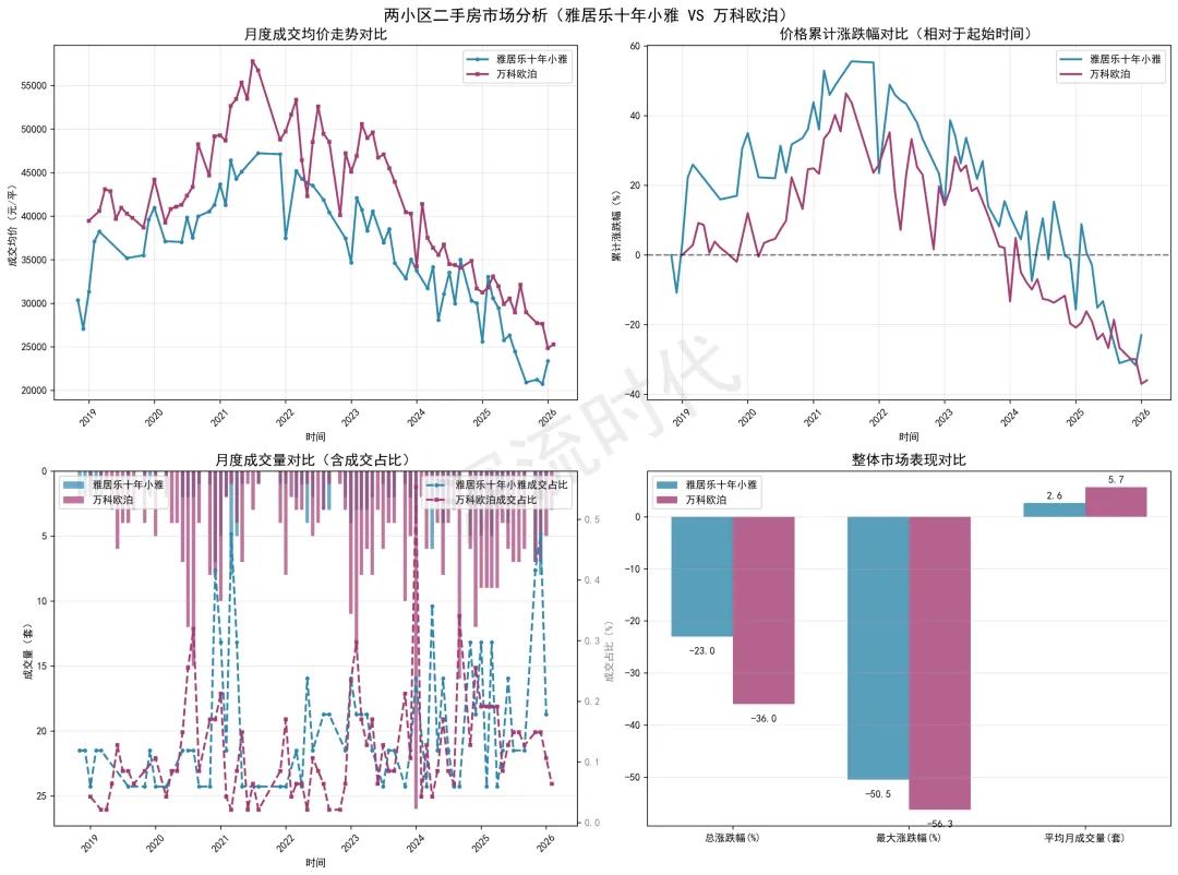 (1)数据显示,两小区在2020年以来均经历显著价格回调,其中万科欧泊起始均价更高(39,474元/㎡),但跌幅更剧烈(累计-35.98%,最大-56.26%),抗跌性弱于雅居乐十年小雅(累计-23.01%)。