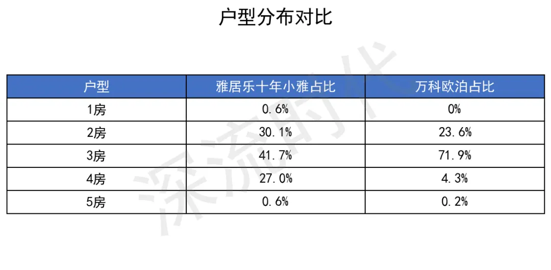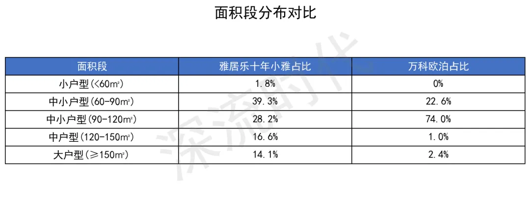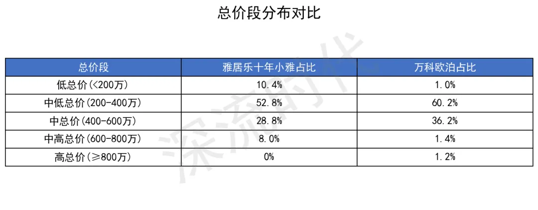 (3)客户偏好上,万科欧泊以90-120㎡三房为主导(占比74%),总价集中于200-400万区间(60.2%);而雅居乐户型结构更均衡,三房、四房占比较高,面积覆盖更广,总价分布亦更分散。