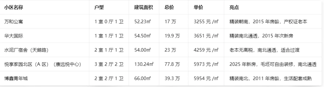 - 这类房源多为老小区、小户型,部分房龄较老,但胜在总价低、税费少(老本),适合短期过渡、出租投资