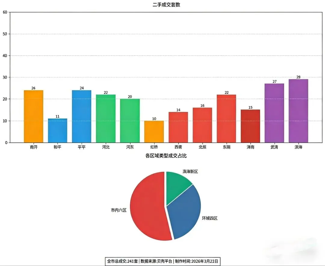 - 滨海新区(29套)、武清区(27套)表现强劲,合计占比约 23.2%,远郊区域成交占比约 26.1%。