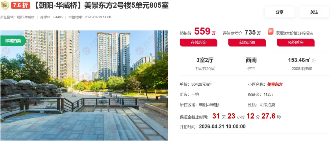 本次拍卖房产为美景东方2号楼5单元805室,建筑面积153.46㎡,3室2厅格局,西南朝向采光通透,空间格局开阔,居住舒适度拉满。此次挂拍起拍价为559万,评估参考价约735万,相当于7.6折起拍,定于2026年04月21日10时开拍,房屋相关信息已调查完成,可联系我们获取尽调报告及预约看房!