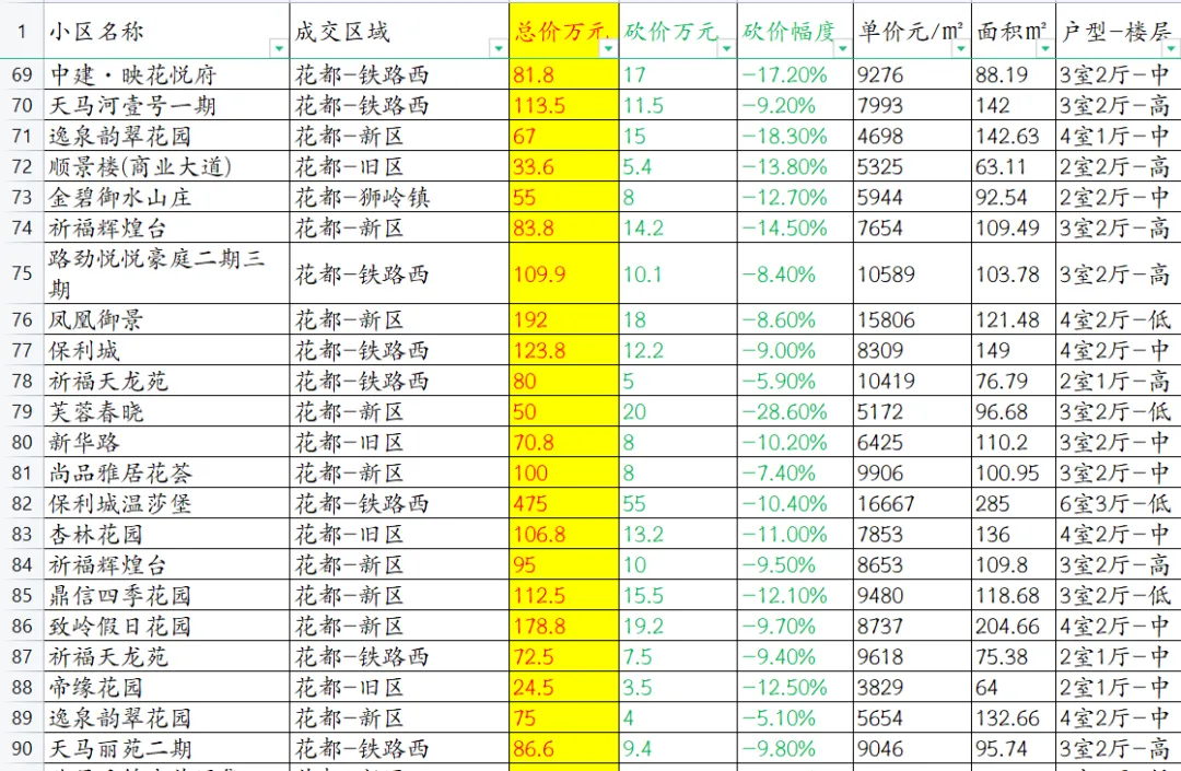 数据详情请查看图片,其中总价代表真实成交价,砍价万元+总价万元=挂牌价。