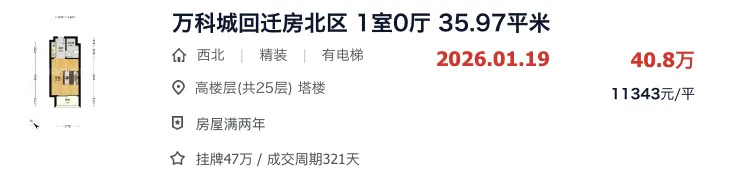 上冲万科城回迁房北区35平1房的户型,总价已经来到40.8万了。