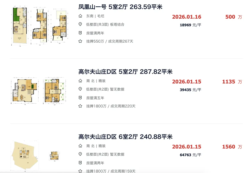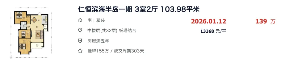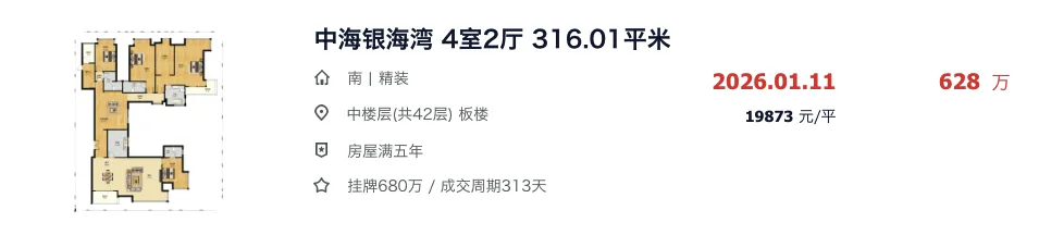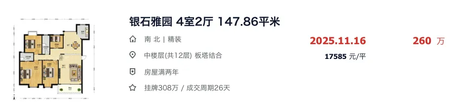 银石雅园大面积的四房,挂牌价308万,最终成交价也来到了260万。