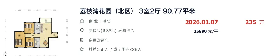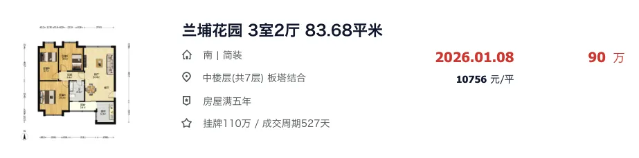 像兰埔花园的83平3房,成交总价也来到了90万。