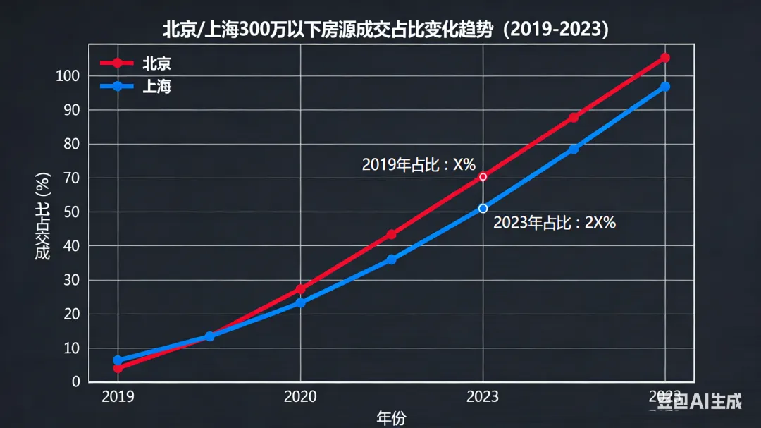 数据最能说明问题。在北京,总价300万以下的房源占二手房成交的比例,从五年前的23.3%大幅提升至46.7%-1。在上海,总价300万以内的入门级房源3月上半月成交占比升至72%-2。