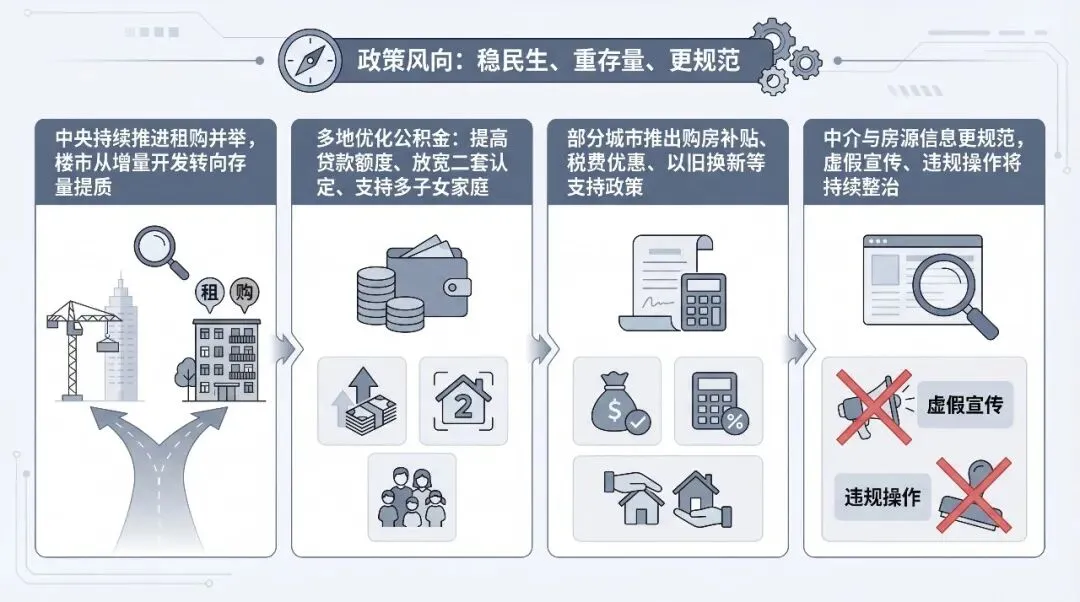 今年房地产政策的核心基调愈发清晰,从中央到地方,层层发力为刚需和改善家庭减负,同时推动行业向高质量发展转型。中央层面,“十五五” 规划纲要将房地产单列成章,明确提出加快构建房地产发展新模式,健全租购并举的住房制度,让居住属性成为房产的核心价值。自然资源部也发布新规,明确新增建设用地优先保障重大项目与民生需求,原则上不再用于经营性房地产开发,并建立存量盘活与新增用地挂钩机制,这意味着未来楼市将从“增量开发” 转向 “存量提质”,核心城市核心区域的优质房源稀缺性将进一步提升。