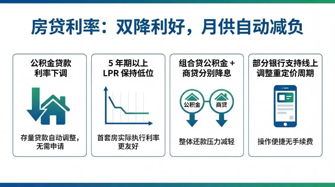 2026 年开年的房贷利率双降,成为房贷族的重磅 “减负红包”,且全程无需手动申请,系统自动调整,公积金和商贷各有优惠,组合贷用户也能双重享受福利。