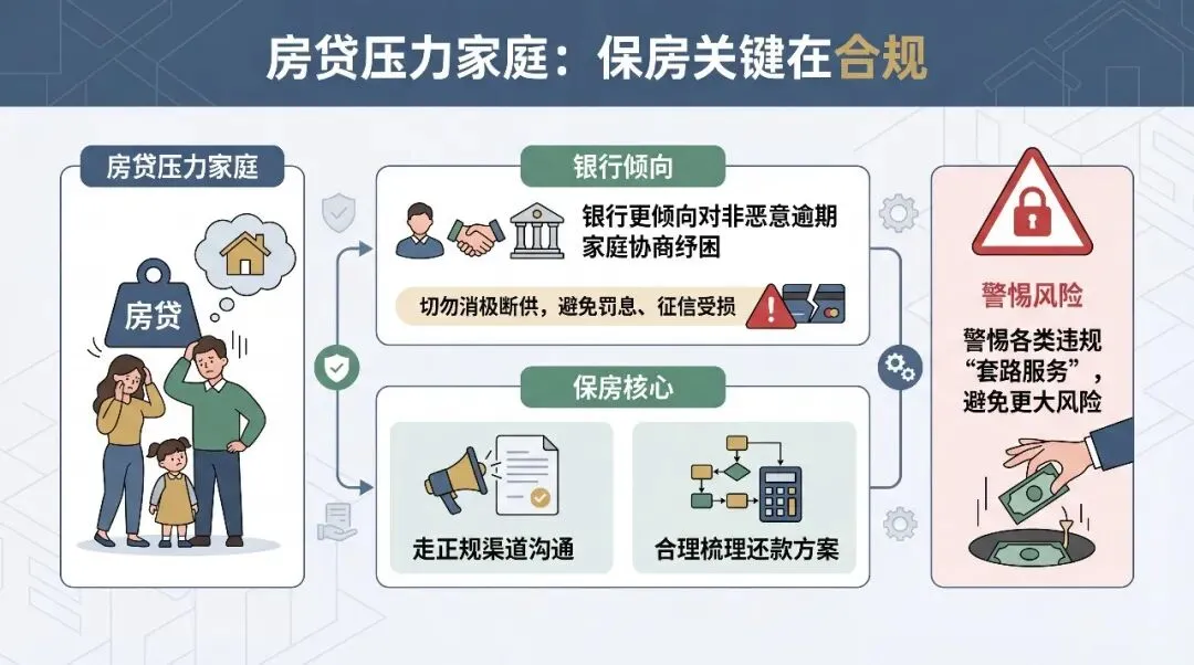 但保房的核心前提是100% 合规,坚决避开市面上的各类“保房套路”,谨防花了高额费用却触发额外法律风险。正规的保房流程有明确步骤:首先做全面的房产风险评估,理清逾期罚息与整体债务结构;再对接银行正规协商渠道,制定延期还款、债务梳理等合理的纾困方案;同步做好资产隔离,规避不必要的催收困扰与法拍风险。