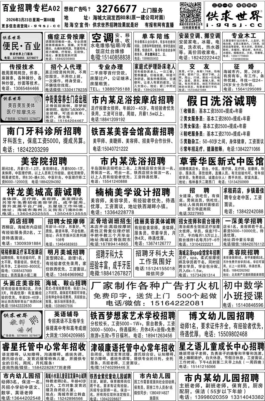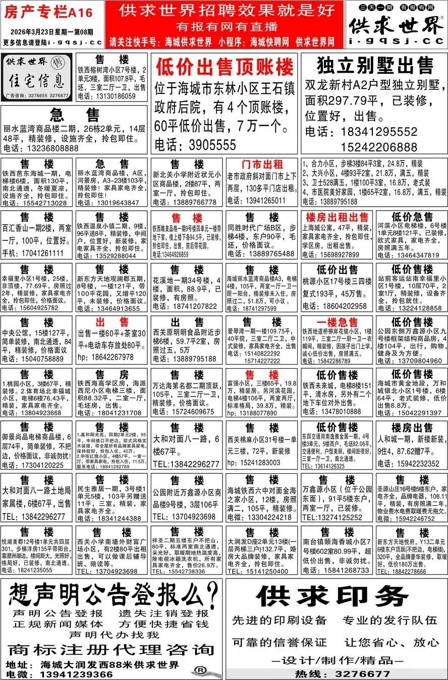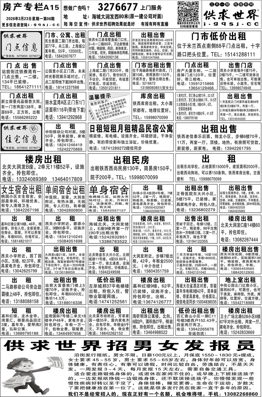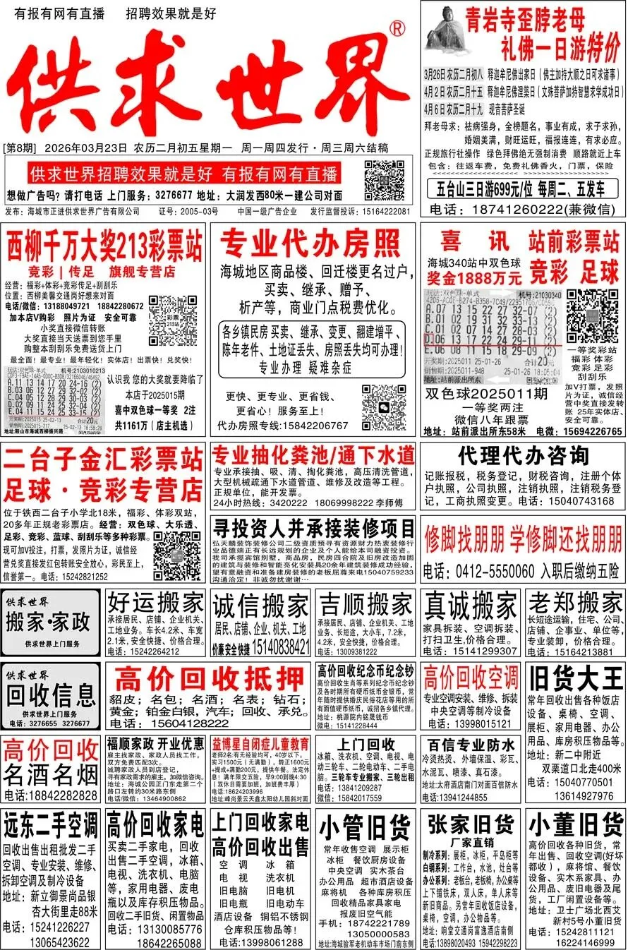 第8期《海城供求世界电子报》招聘房产等信息更新了,提前24小时抢先阅读(2026.3.23)