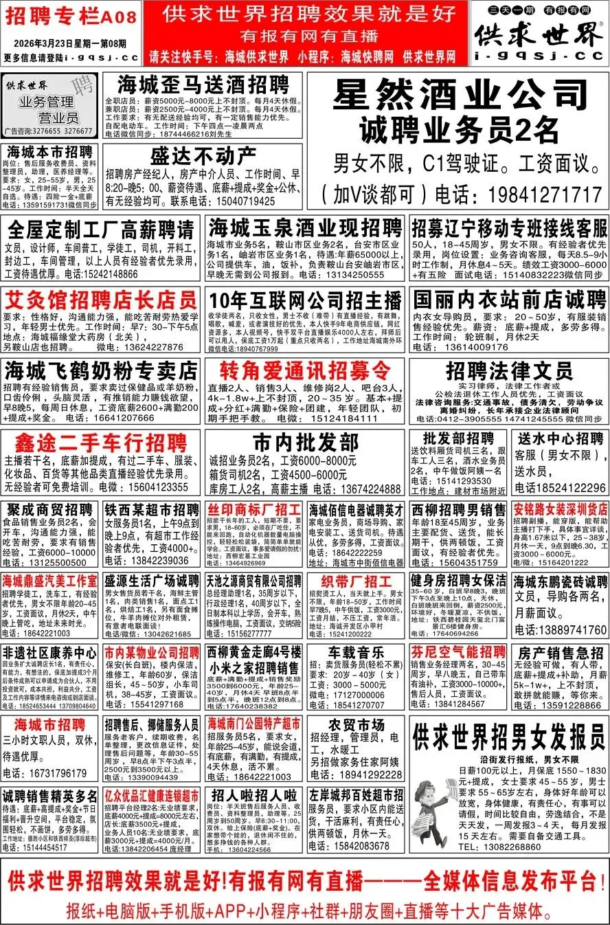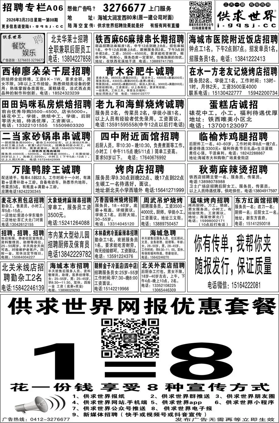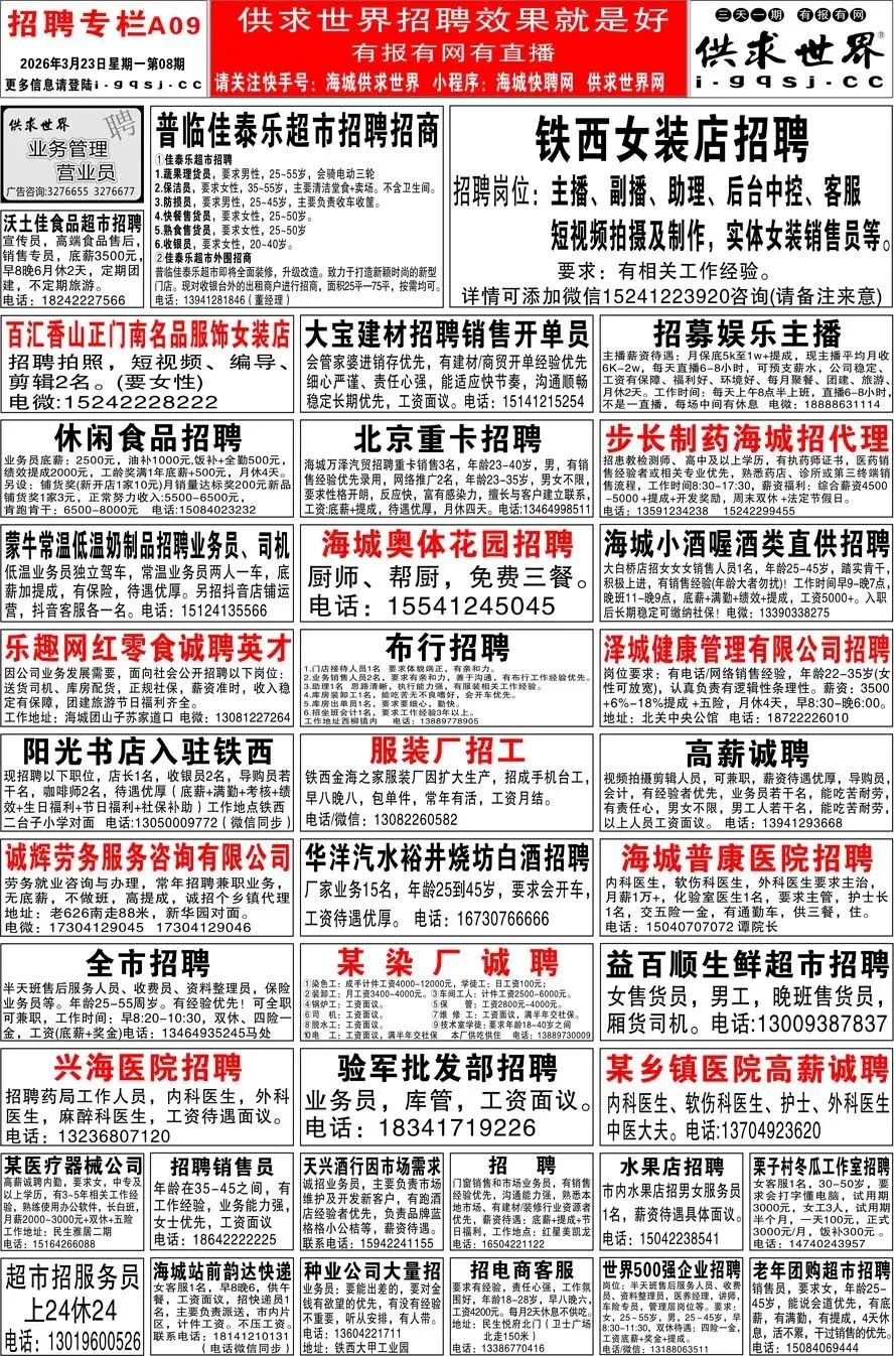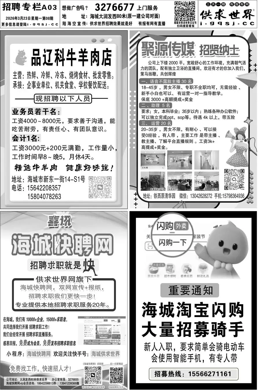 第8期《海城供求世界电子报》招聘房产等信息更新了,提前24小时抢先阅读(2026.3.23)