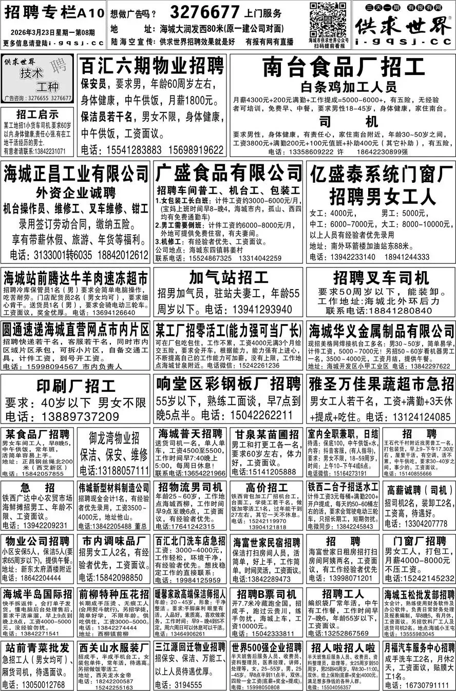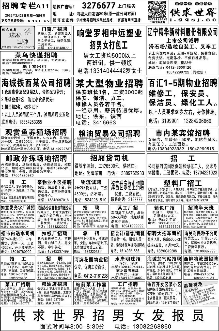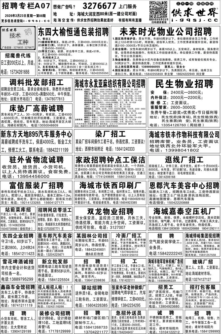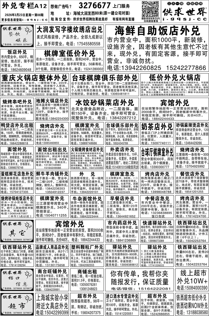 第8期《海城供求世界电子报》招聘房产等信息更新了,提前24小时抢先阅读(2026.3.23)