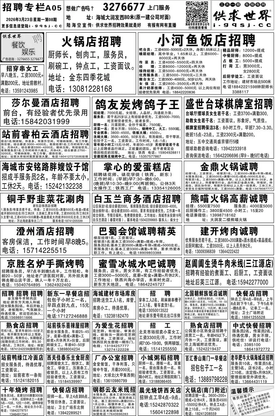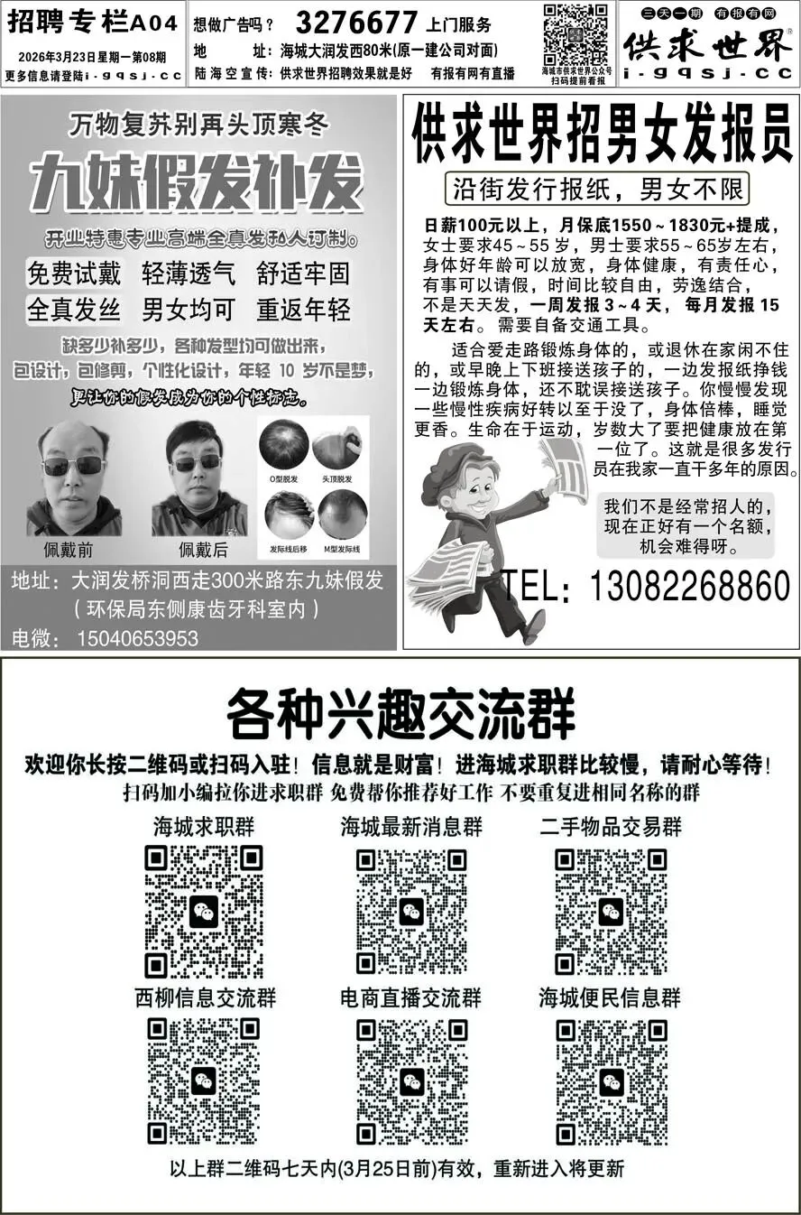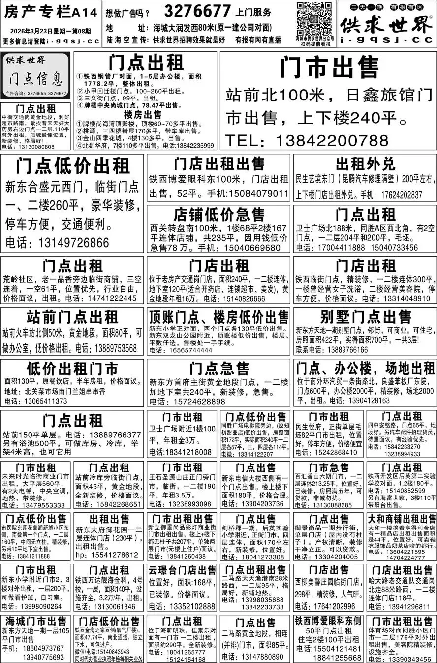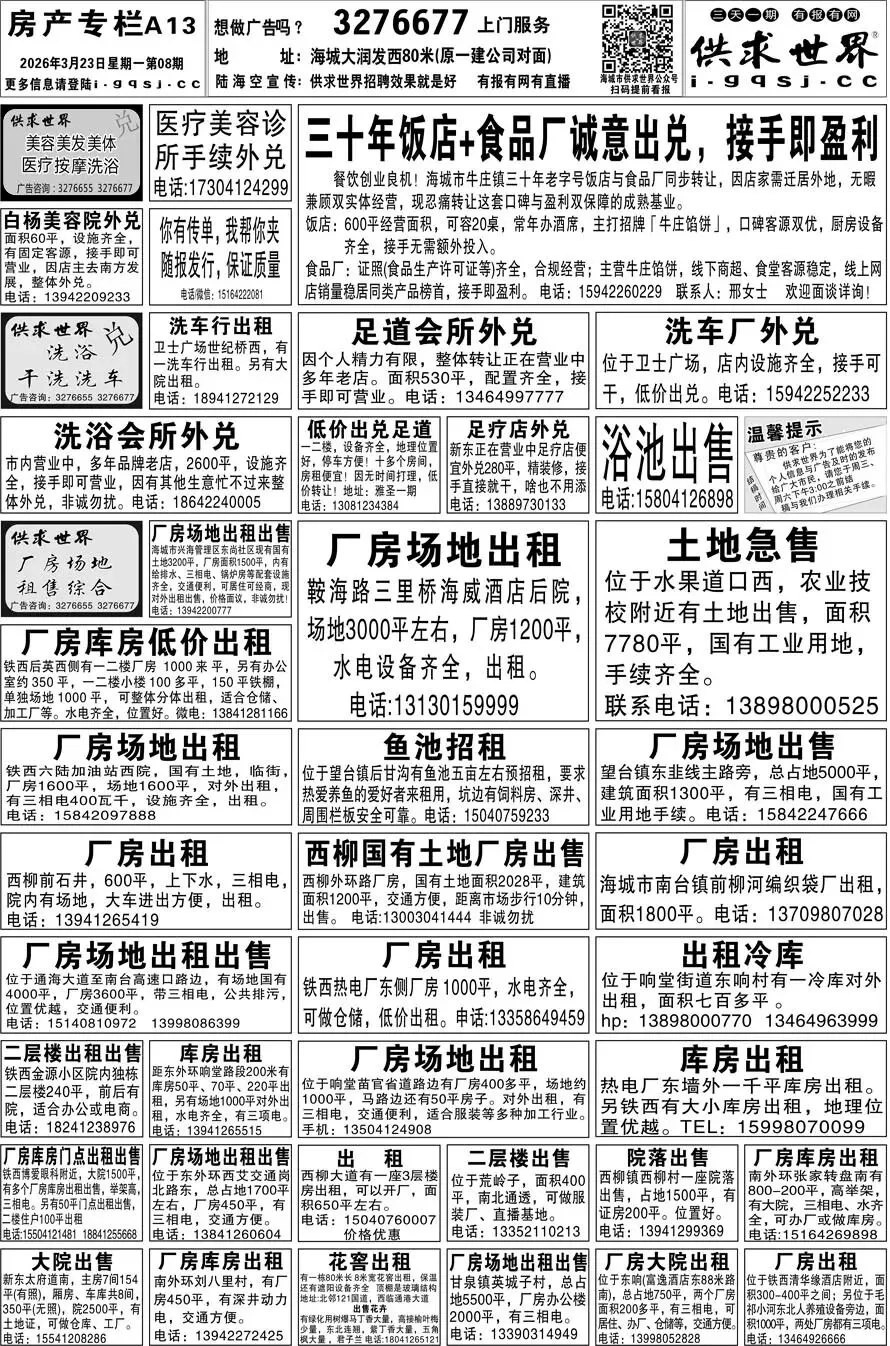 第8期《海城供求世界电子报》招聘房产等信息更新了,提前24小时抢先阅读(2026.3.23)
