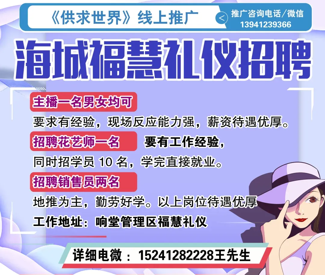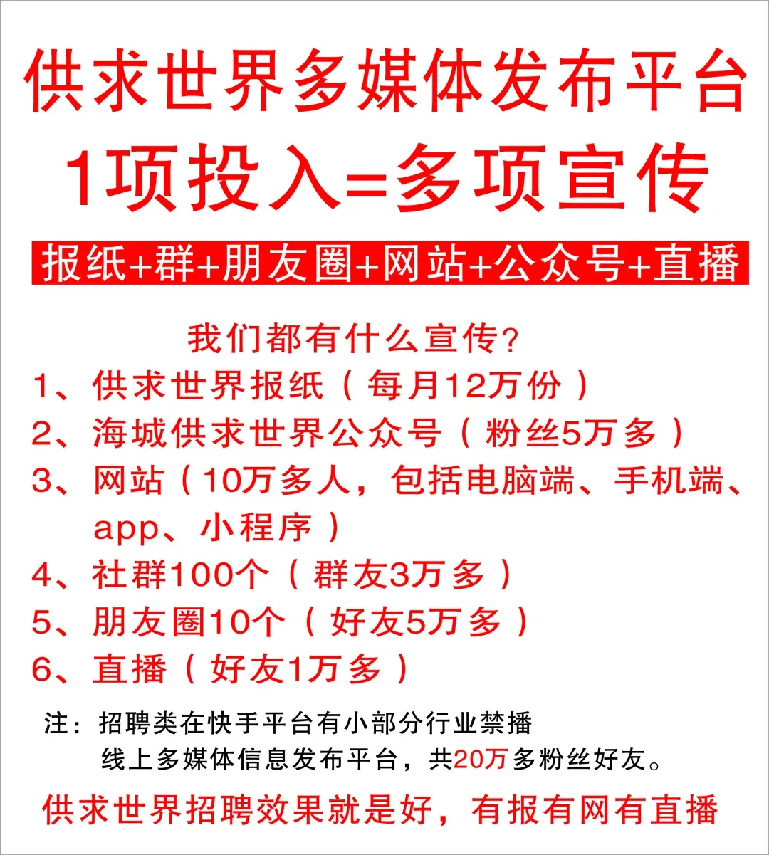 供求世界不是单纯的报纸,我们是多媒体信息发布平台,有报有网有直播,深耕海城20年,服务家乡人,不断创新,与时俱进,立体宣传,便民利民。经营理念:以低廉的价格为供求世界双方牵线搭桥,以确实的效果助客户在商战中取胜!企业价值观:自信 勤奋 成长 服务 感恩
