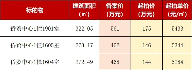 本次被法拍的3套房产,位于侨贸中心的16楼和19楼,产权归开发商所有,单套建筑面积在273㎡至322㎡之间,总起拍价465万元,折算下来,起拍均价仅约5358元/㎡。