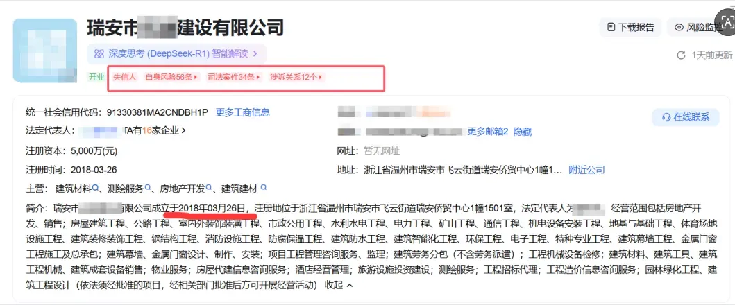 天眼查公开资料显示,侨贸中心的开发商“瑞安市某建设有限公司”早已成为失信被执行人,公司及相关法人代表被限制高消费。