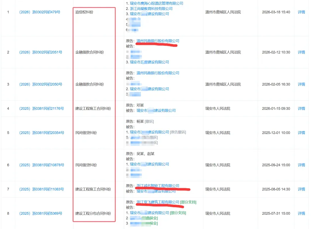 从2024年到2026年初,该公司涉及的开庭公告就多达22条。纠纷类型五花八门:金融借款合同纠纷、建设工程施工合同纠纷、民间借贷、融资租赁……原告方包括温州民商银行、温州融资担保公司以及多家建筑、设计单位。