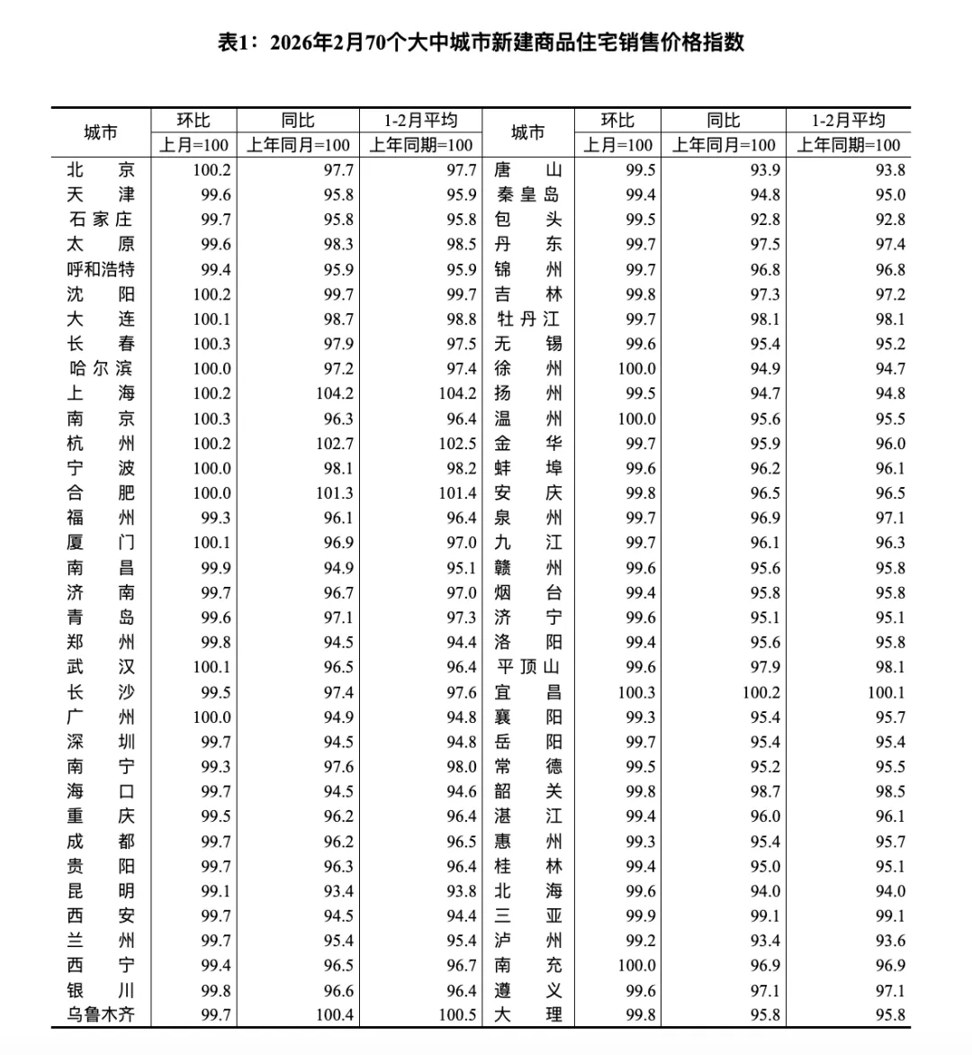 国家统计局城市司首席统计师王中华解读2026年2月份商品住宅销售价格变动情况统计数据称,2026年2月份,总体看70个大中城市商品住宅销售价格环比降幅继续收窄、同比下降。新建商品住宅销售价格环比上涨或持平城市个数比上月增加。