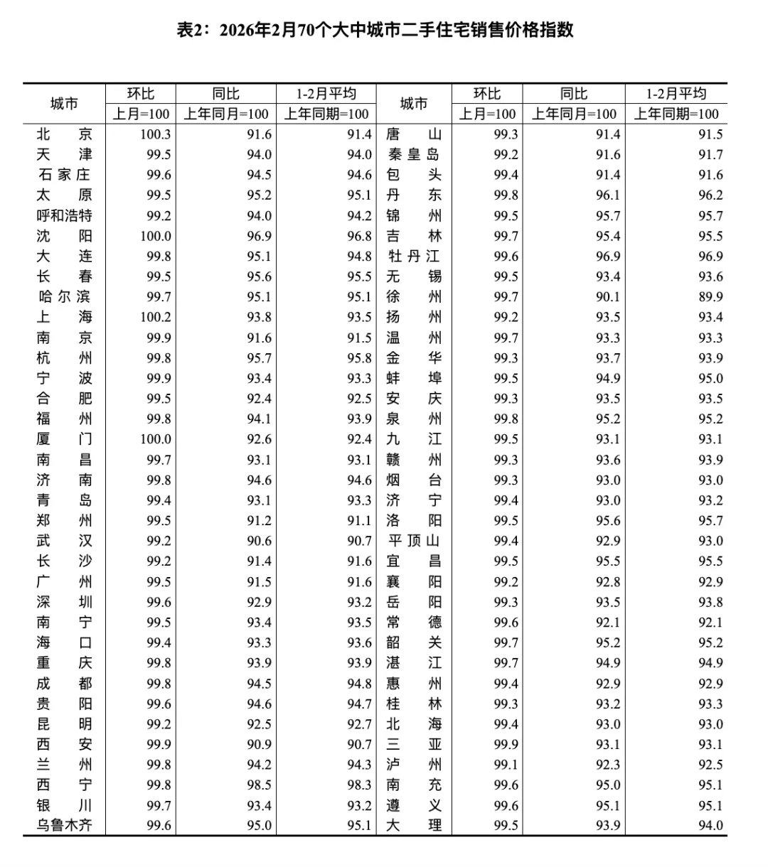 近日,国家统计局发布了2026年2月70个大中城市商品住宅销售价格变动情况统计数据。2月份商品住宅销售价格环比降幅继续收窄。其中,山东纳入统计的4个城市济南、青岛、烟台、济宁,新房和二手房价格均持续回落。