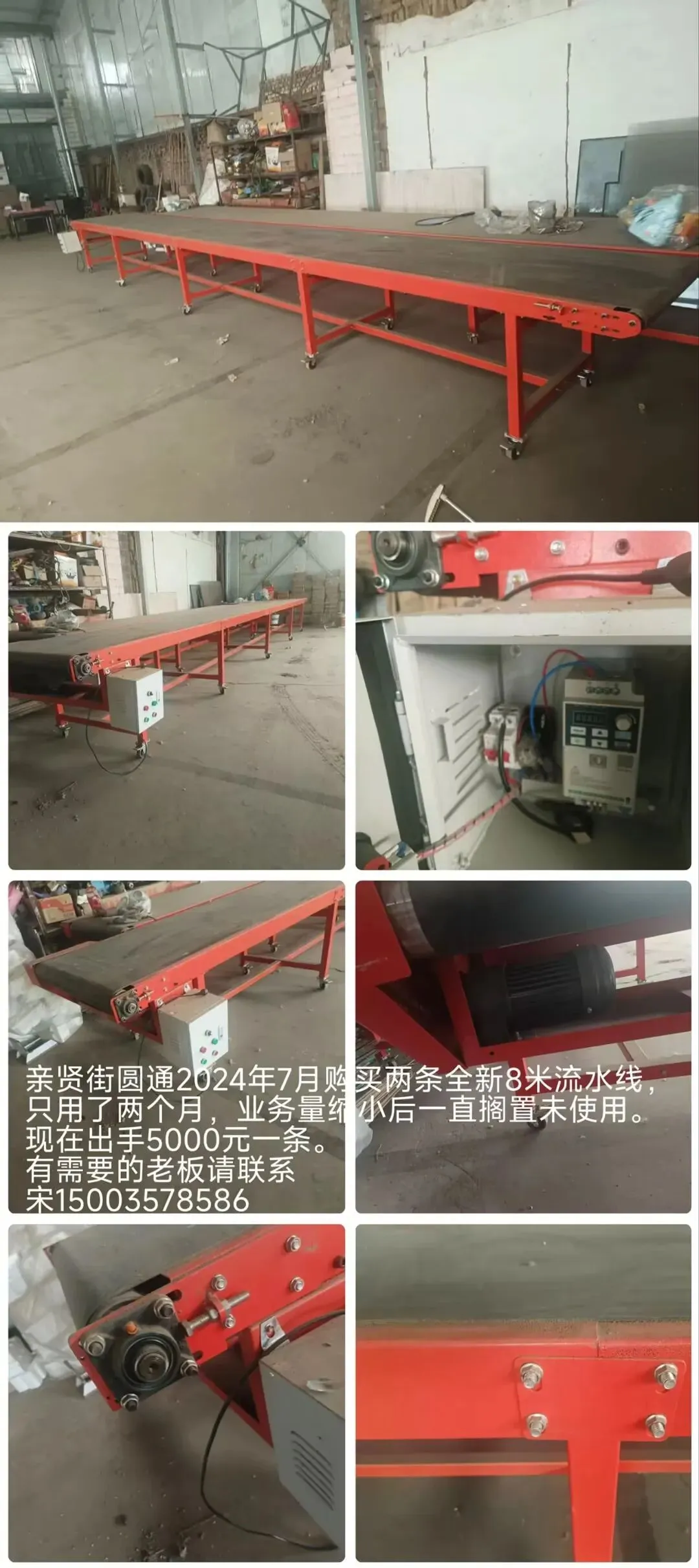 亲贤街圆通2024年7月购买两条全新8米流水线,只用了两个月,业务量缩小后一直搁置未使用。现在出手5000元一条。有需要的老板请联系宋15003578586