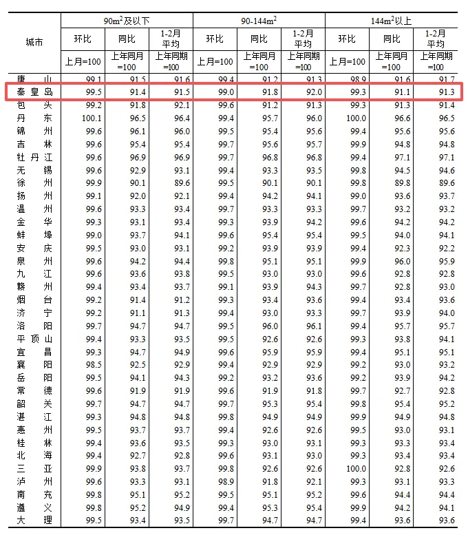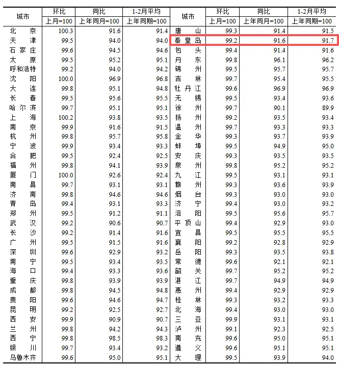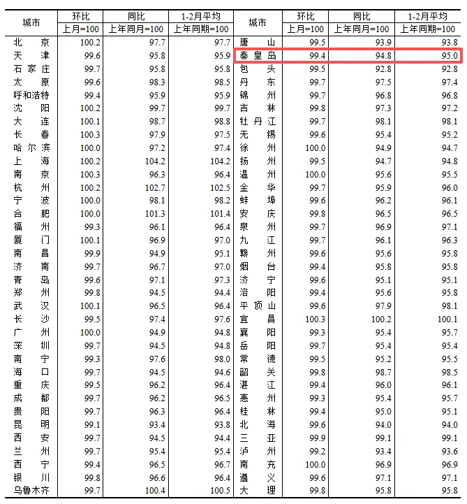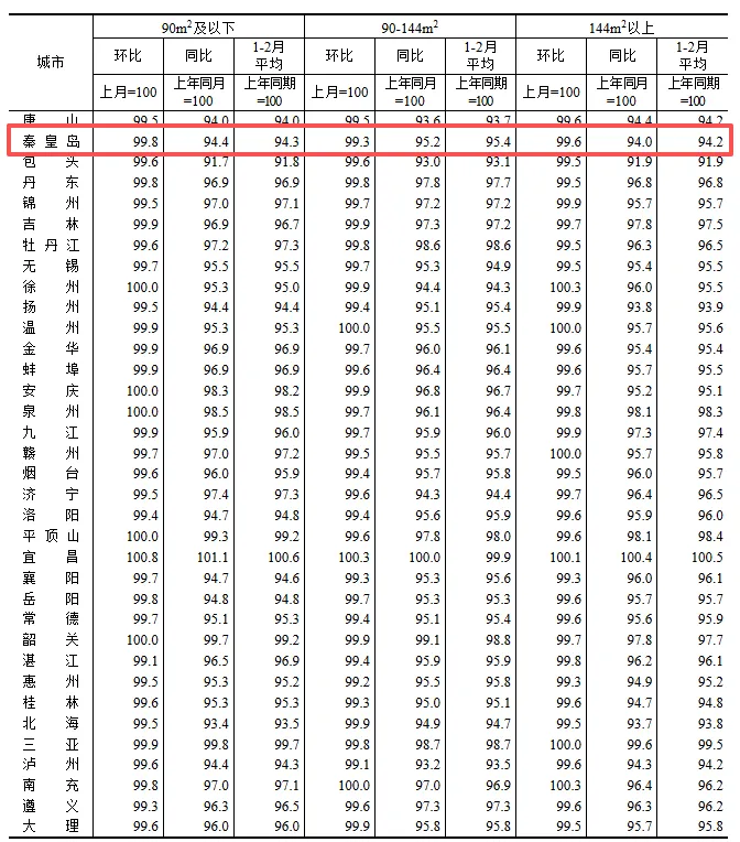 秦皇岛2月新房价格分类指数
