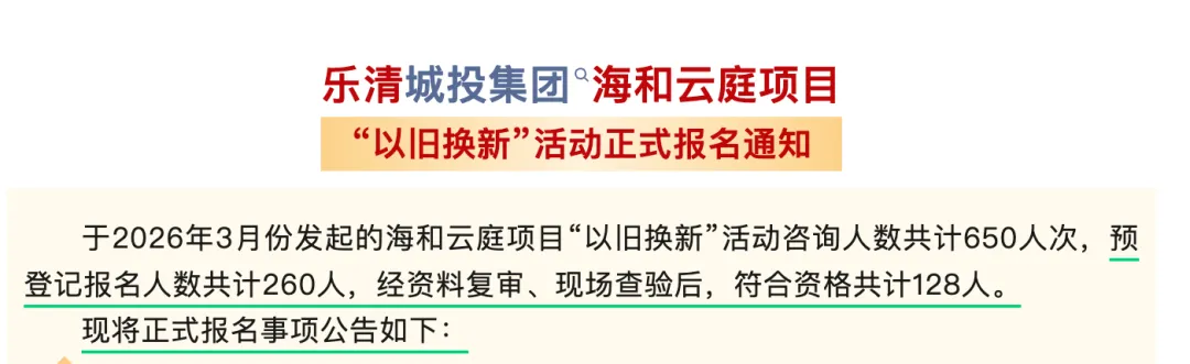 据乐清城投消息,3月1日至3月11日举行的海和云庭项目(滨海未来社区)“以旧换新”活动,咨询人数累计达650人次,预登记报名人数共计260人。经资料复审、现场查验后,最终符合资格的业主为128人。