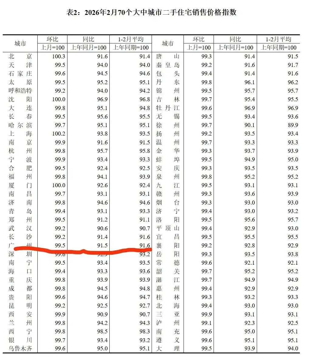 广州一手房和二手房的价格走势,也印证了这一点。根据国家统计局公布的广州市2月份新房和二手房价格指数,一月份新房止跌了,二手房没有止跌,一手房环比上个月持平,二手房环比上个月跌0.5%。