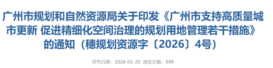 3月20日,广州市规划和自然资源局印发了《广州市支持高质量城市更新 促进精细化空间治理的规划用地管理若干措施》的通知(穗规划资源字〔2026〕4号)。