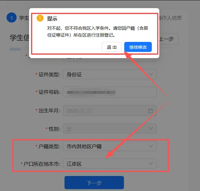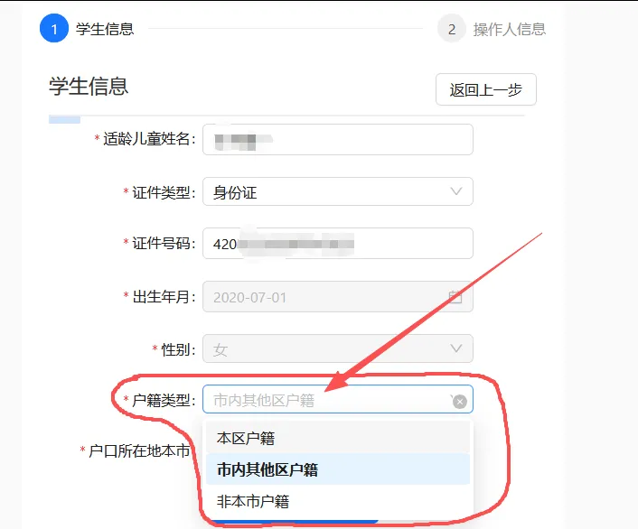 1.填写学生信息的时候,在选择而户籍类型选择时,是否选择了市内其它区户籍;如下图: