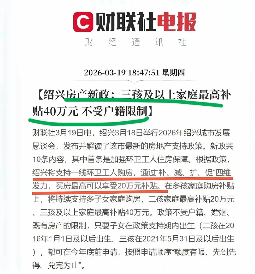 3月18号,2026年绍兴城市发展恳谈会开完,楼市新政“绍十条”就砸出来了。最炸裂的一条是什么?二孩家庭最高补贴20万,三孩及以上家庭最高补贴40万,而且不限户籍、不限婚姻状况、不限你名下已经有多少套房,只要孩子在规定年份出生——二孩要2016年1月1日以后,三孩要2021年5月31日以后——今年年底前申请就行。
