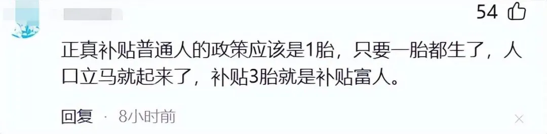 我翻了翻,点赞最高的评论是这种画风的:“真正补贴普通人的政策应该是1胎,只要一胎都生了,人口立马就起来了,补贴3胎就是补贴富人。”