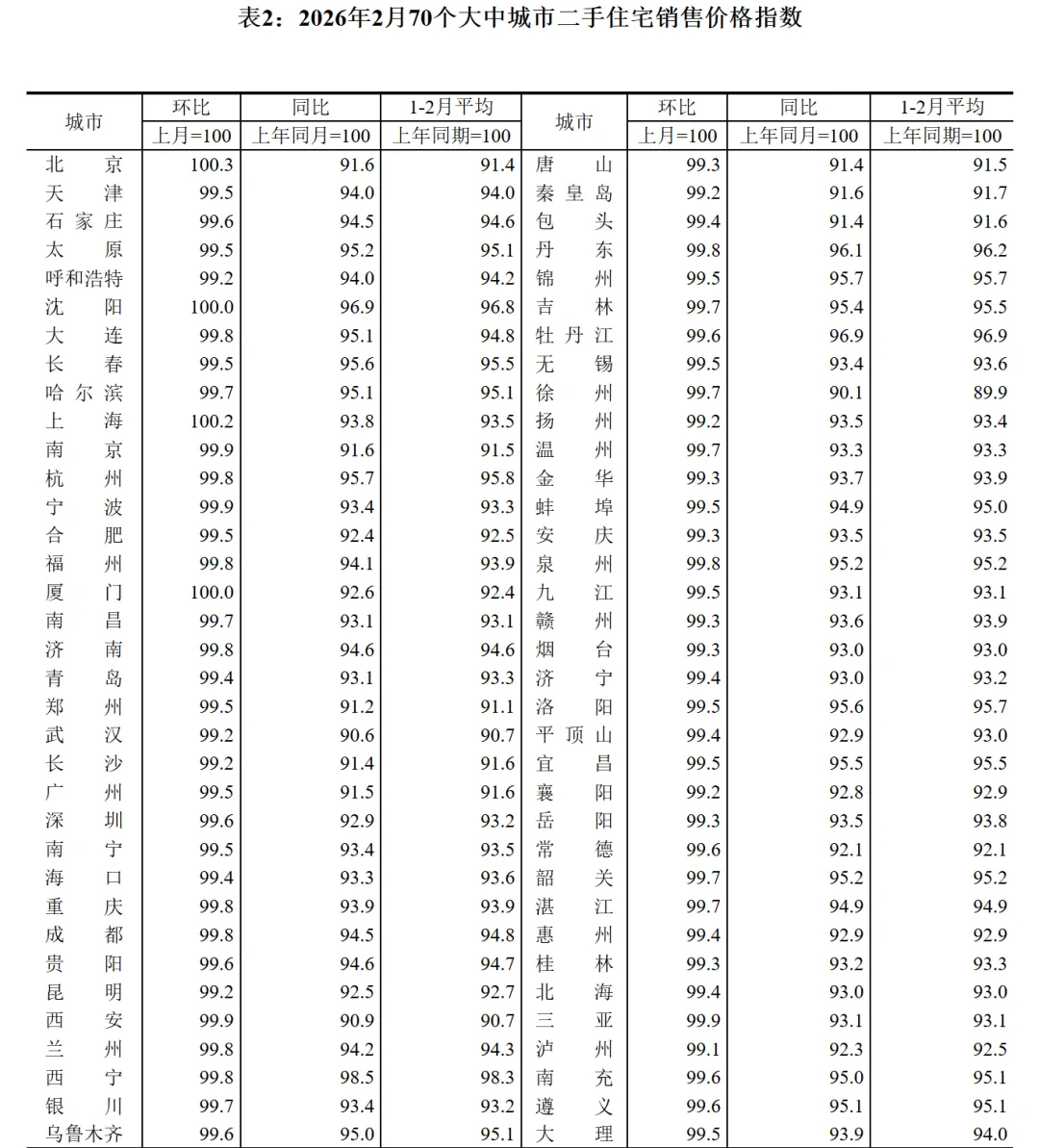 2026年2月70个中大型城市二手房房价 京沪止跌转涨