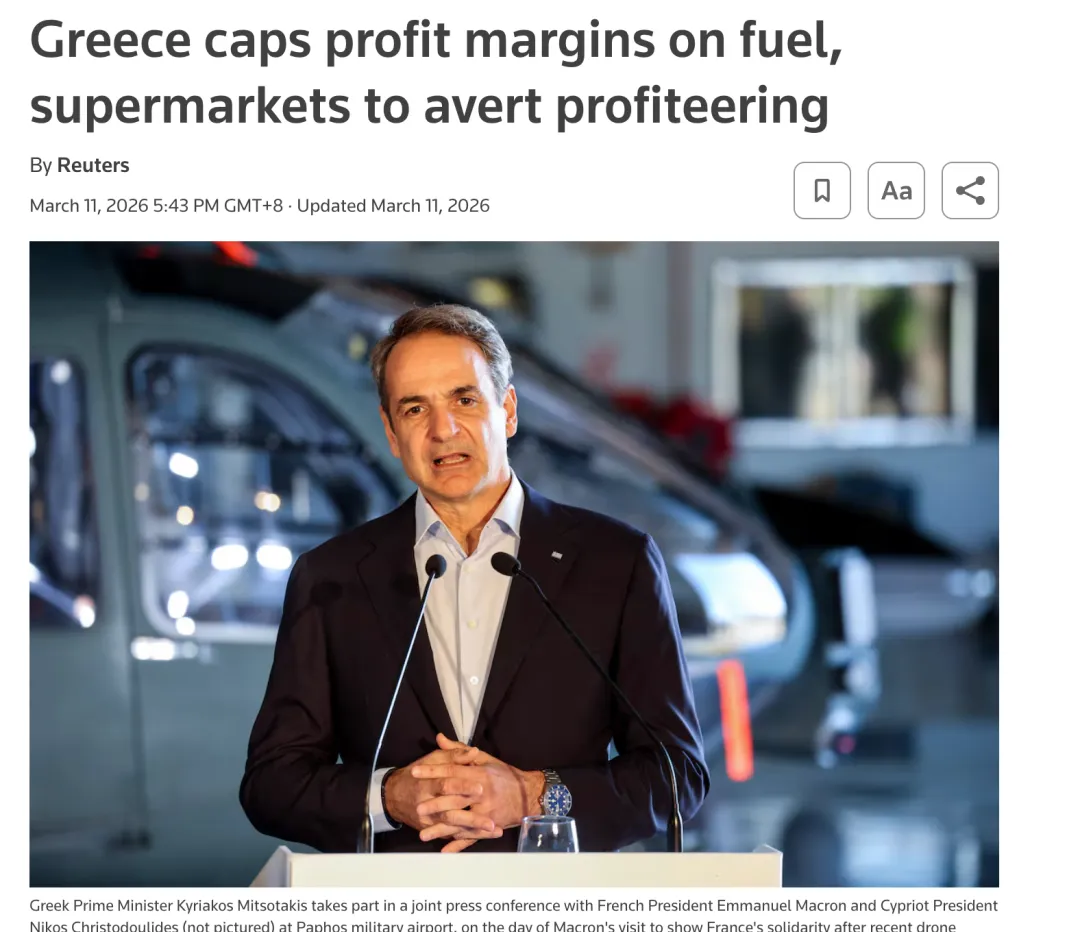 图片来源:https://www.reuters.com/business/retail-consumer/greece-cap-profit-margins-fuel-supermarkets-pm-says-2026-03-11/?utm_