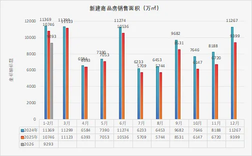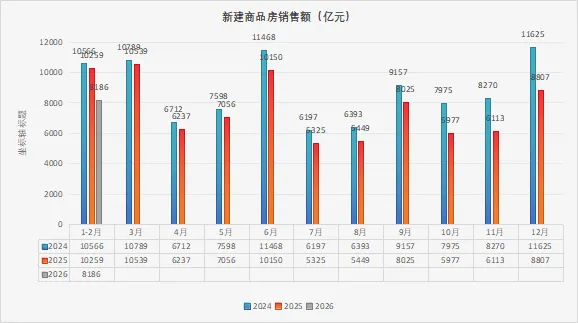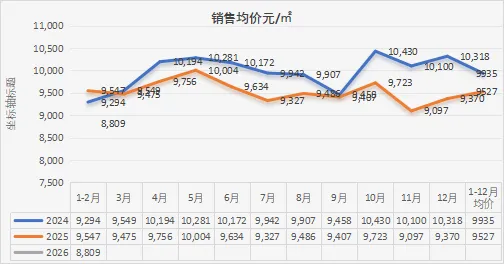 亿㎡.从销售端的数据说明市场也是仍然在萎缩,购房需求没有更大的增量。销售额也是同样的情况,更为直观的体现就是从销售价格来看,也是从2024年1-12月份均价约9935、2025年1-12月份为9527,直接降到8809。可以看出整个市场是量缩价跌,销量持续萎缩,价格持续下探,市场下行的趋势仍未改变。