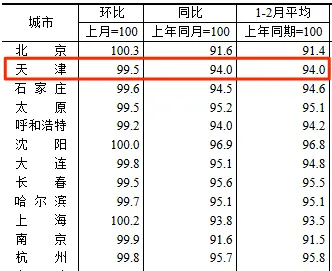 下图为天津市 2026 年 2 月份二手住宅销售价格指数,数据来源于国家统计局2026年2月70个大中城市二手住宅销售价格指数表- 同比较上年同月下降 6.0%,即近一年房价下跌 6%